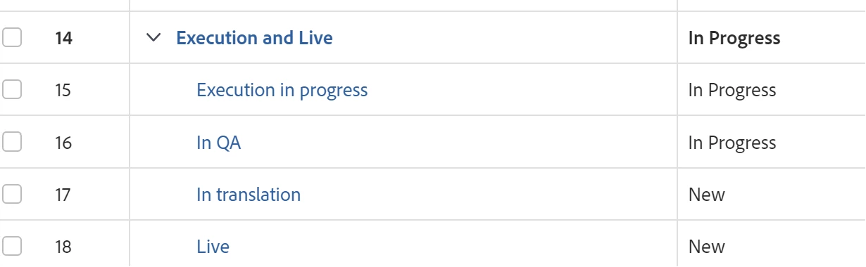 "In the scenario where Task 15 and Task 16 are updated to 'INP' status, the parent task, Task 14, is also automatically updated to 'INP'. I would like to prevent this automatic update. The change in the status of the subtasks should not influence the status of Task 14. How can this be achieved?"