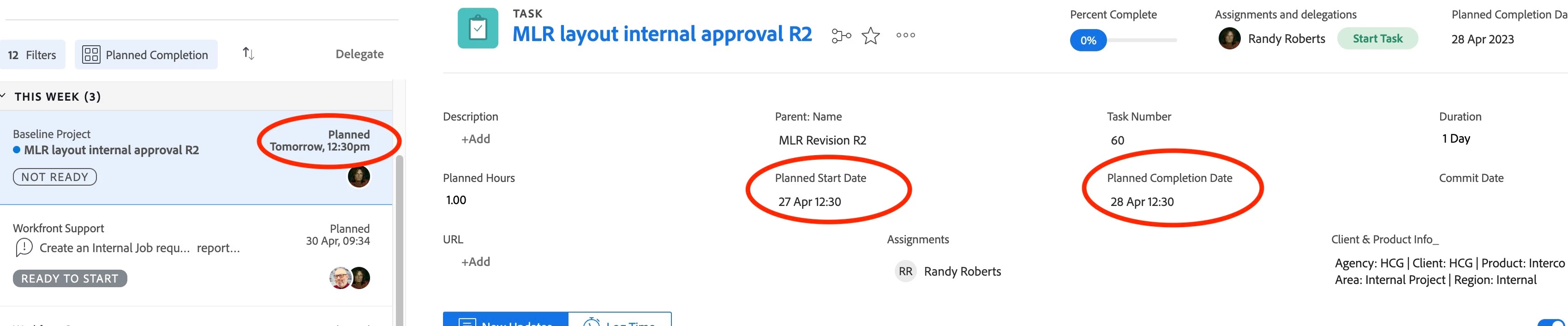 Why is this feature important to you - Working in an agency environment, our tasks are due in hours not days. Our users work out of their Work List to see work items assigned to them. They use the time due to help prioritize their tasks. We have added the Planned Completion Date to the Task header page to show at the top of the Task page and the Task Summary Panel on the Home page, but it only shows the Date due not the time due. When assignees click on the Planned Completion Date field in the Header to view the time due in the Calendar popup window, it changes the task constraint to MUST FINISH ON (even if they just view the calendar popup and don't modify the date or time).