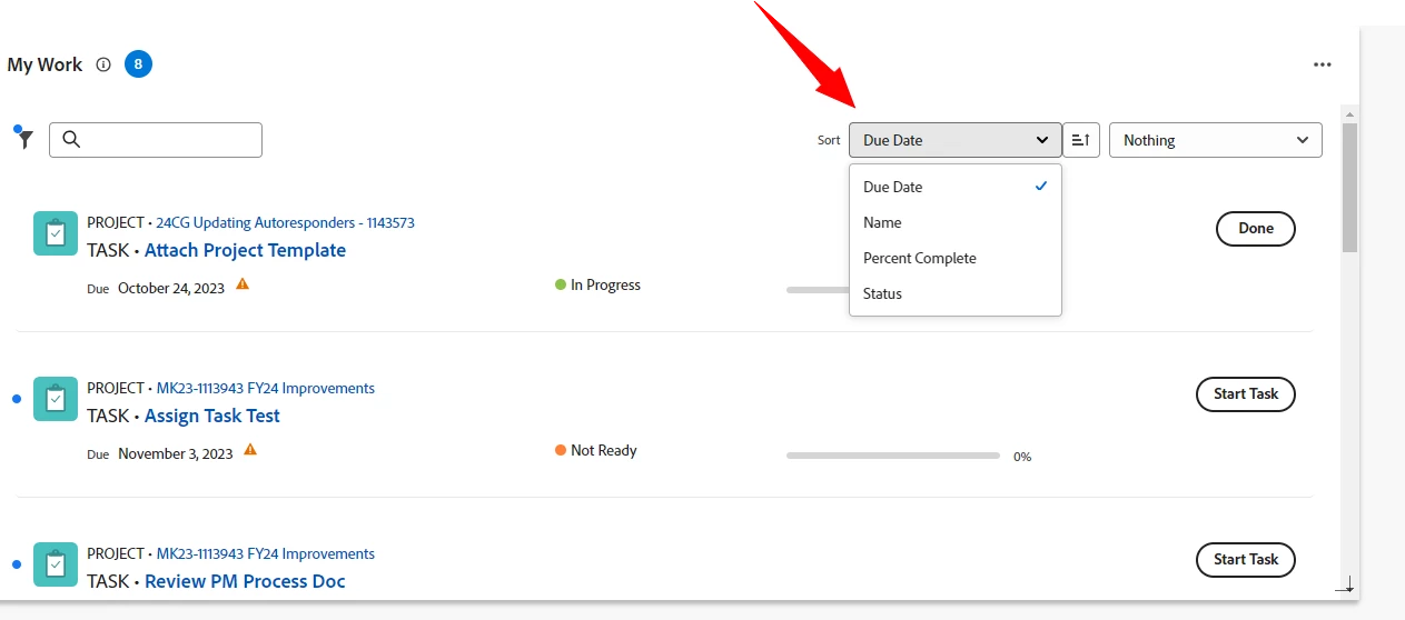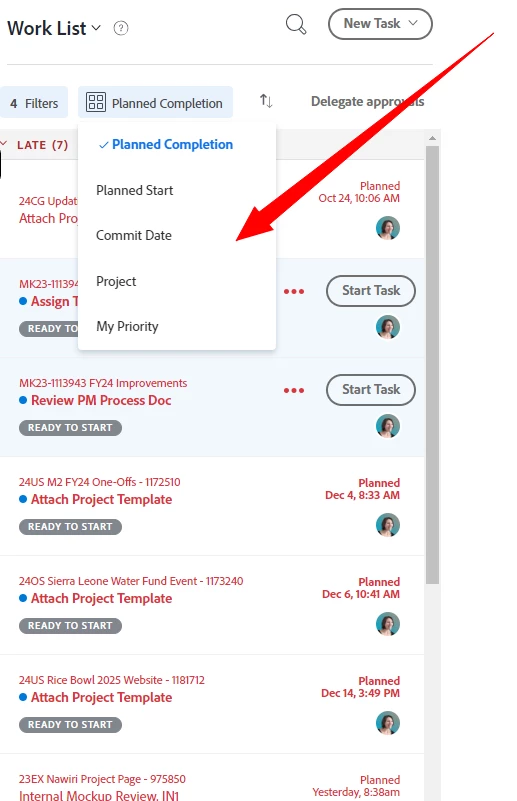 Current Behaviour - Only sort options available are by Planned Completion, Planned Start, Commit date, Project, and My Priority