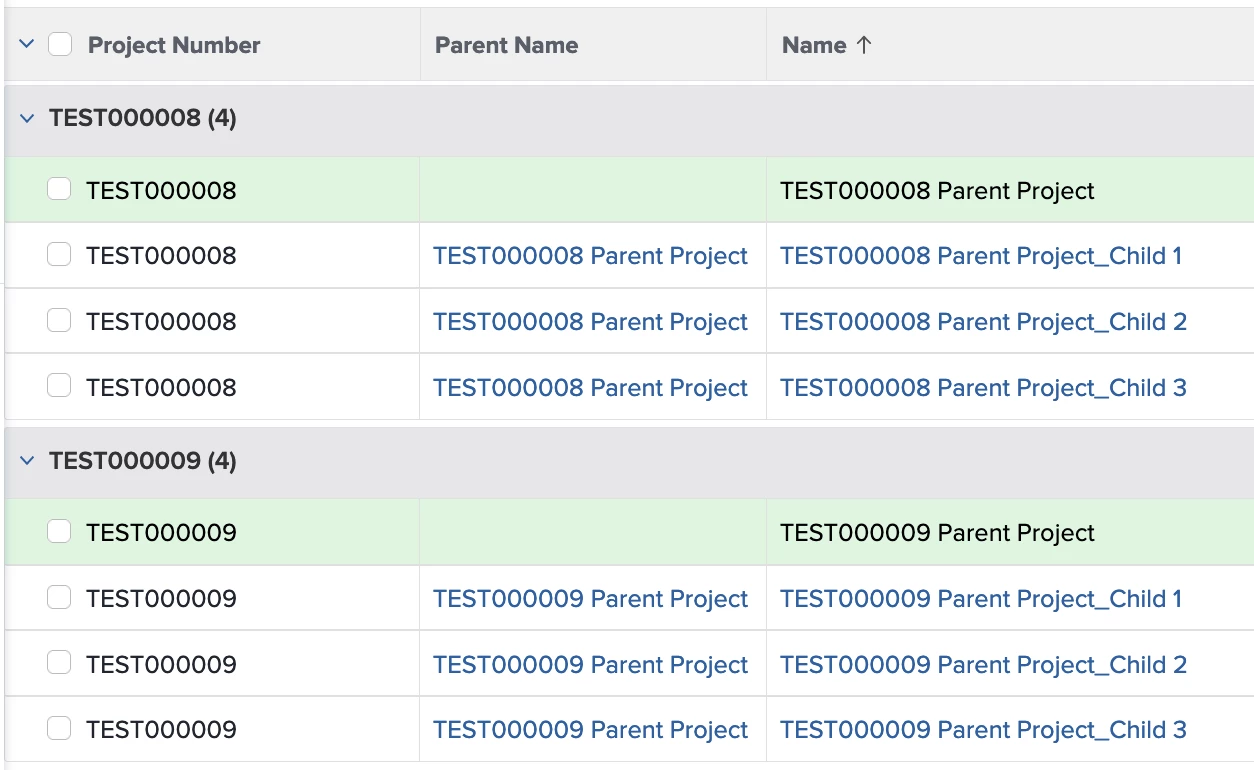Fusion will append the parent project number (We have Fusion generating custom sequential project numbers. For test project it does TESTXXXXXX) and project name to the Child project name. Using a view and grouping then shows us that relationship at the project level.