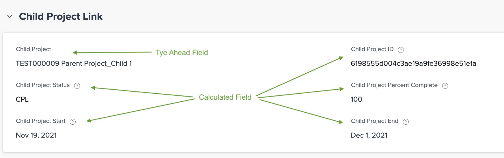 This custom form then pulls basic info from the child project to the associated task on the parent project (Calculated fields populate with Child Project ID, Child Project Status, Child Project Percent and child start and end dates).