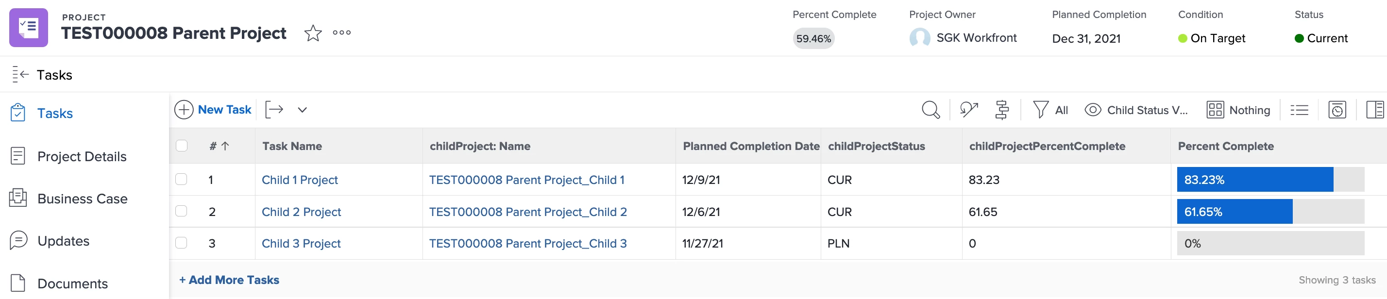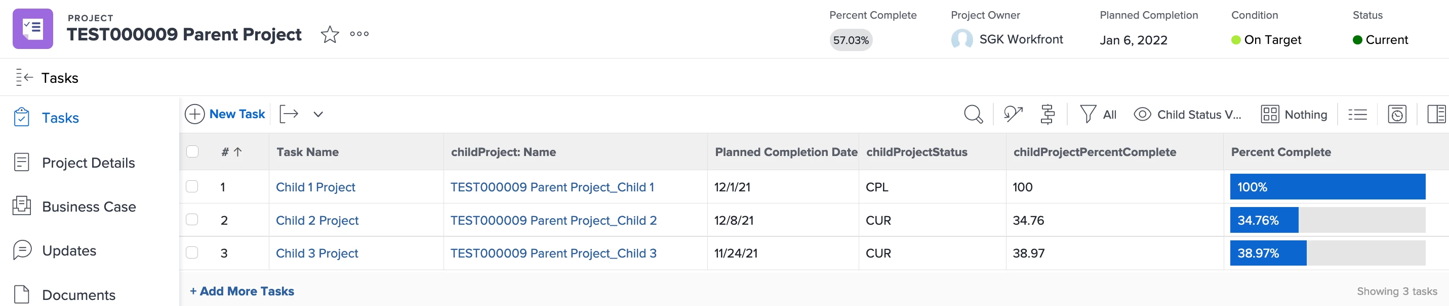 The next phase is getting child info to populate to the parent. In this case we have a custom form on each task of the parent project, and we again use a type ahead, this time assigning the child project to tasks on the parent.