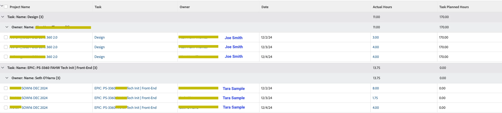 Has anyone cracked the code on generating a report that shows planned hours and actual, by assignee, for any given calendar date range, when there are many assignees on a given task? That last part is the kicker. If we only had one assignee per task I could generate this report.