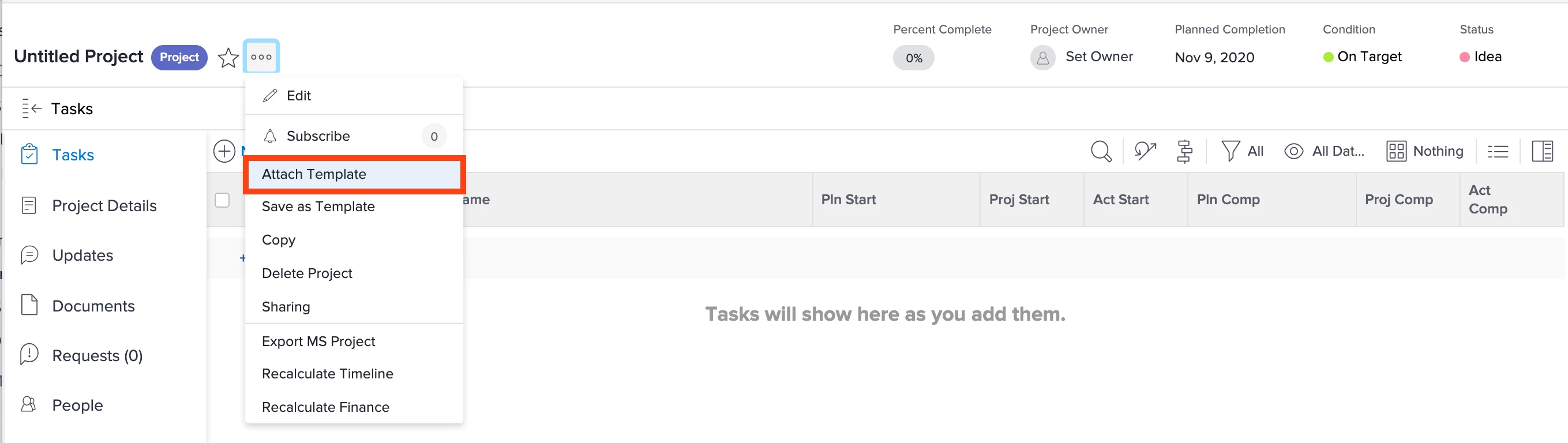Right now, any template that is created for a project shows up under the new project "Project+" button in the project object, but this idea is to allow the creation of project level templates that would not be used for initial project creation, but will show up in the "Attach Template" search bar once the project is created.