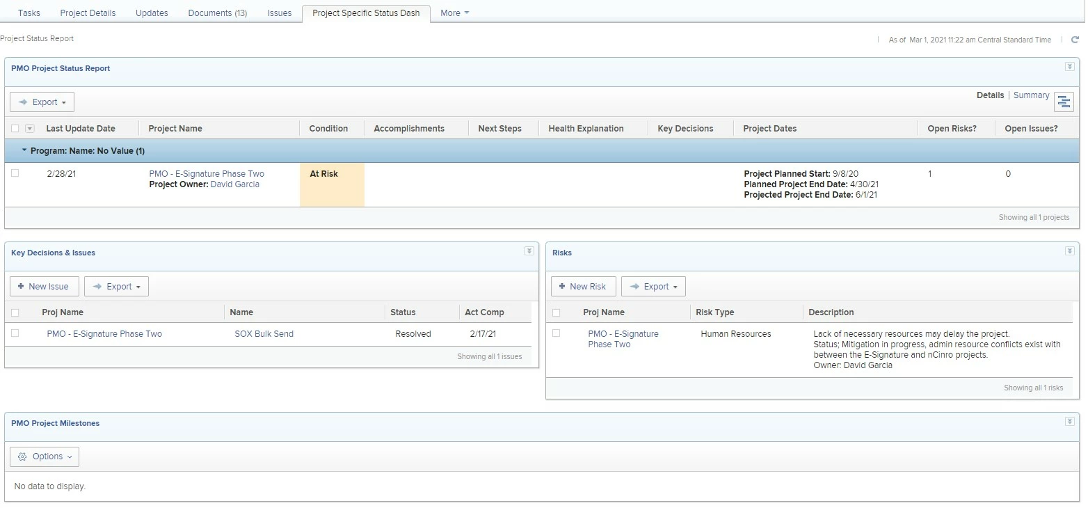 The current Project Specific Dashboard does not allow for exporting the project status, key decisions & Issues, risks and milestones as one page. The user can only export individual sections which is not useful for reporting to management in a concise, meaningful manner. I am not an expert but I believe this to be a fairly straightforward fix via mapping to one export screen. If this is achieved, users would have a handy one page update to produce directly from Workfront as a PDF. Please prioritize this idea. It would be an excellent selling point for Workfront. (note, adding a small budget or expense field in the same report would be great)