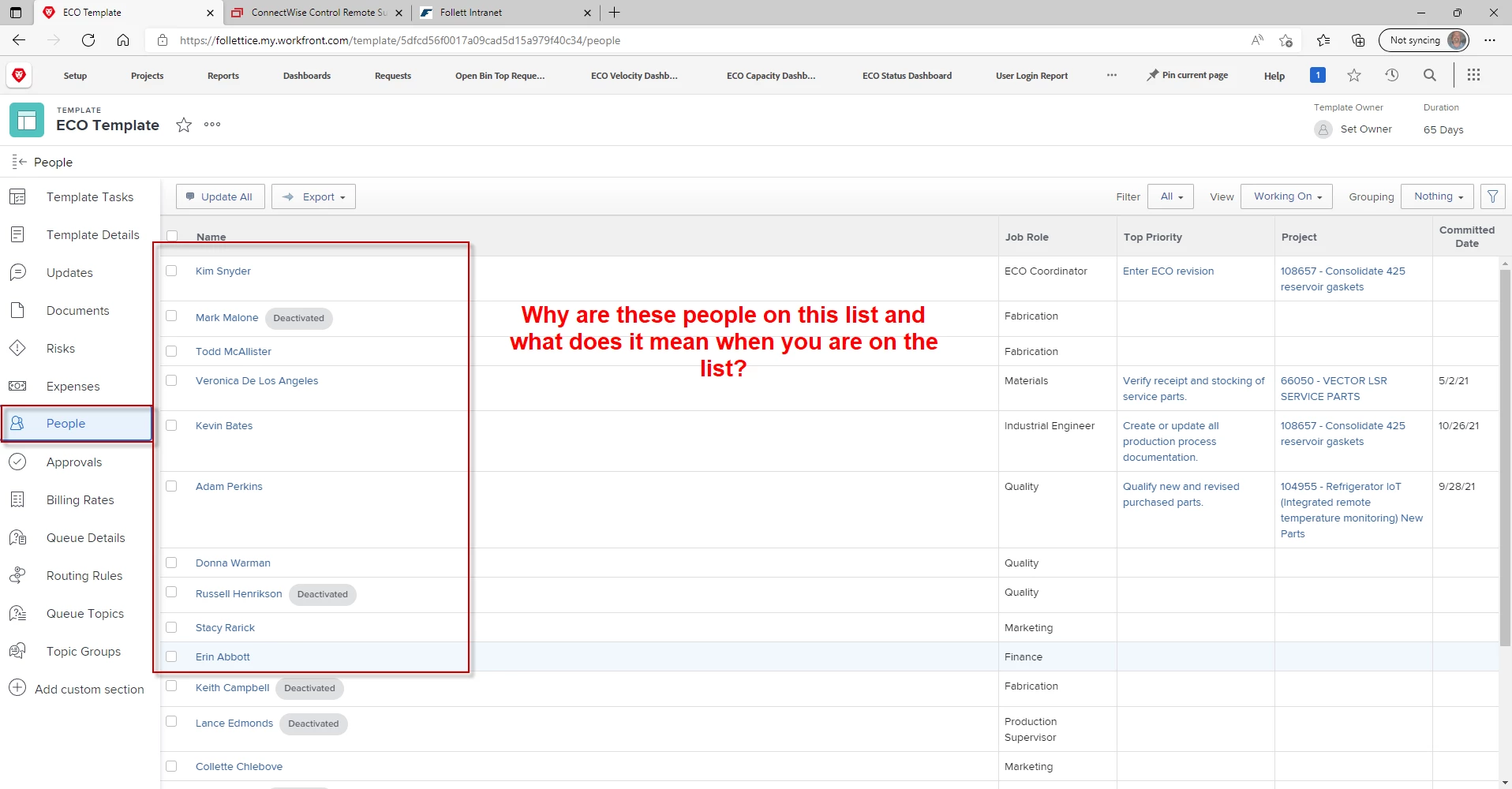 We created a project template two years ago. Its a typical template with both roles and people assigned to tasks. I was just called by a Workfront user telling me he gets an email when every project created by this template is set to active status even though he has not been assigned to a project task. When looking into this issue I noticed a "People" selection when viewing the project template. (See screen capture below) When I clicked on "People", I get a list of people. Some have tasks on the project template and do not. How did all this people get on the list? What does it mean when they are on the list. I have some people who have been deactivated on the list.