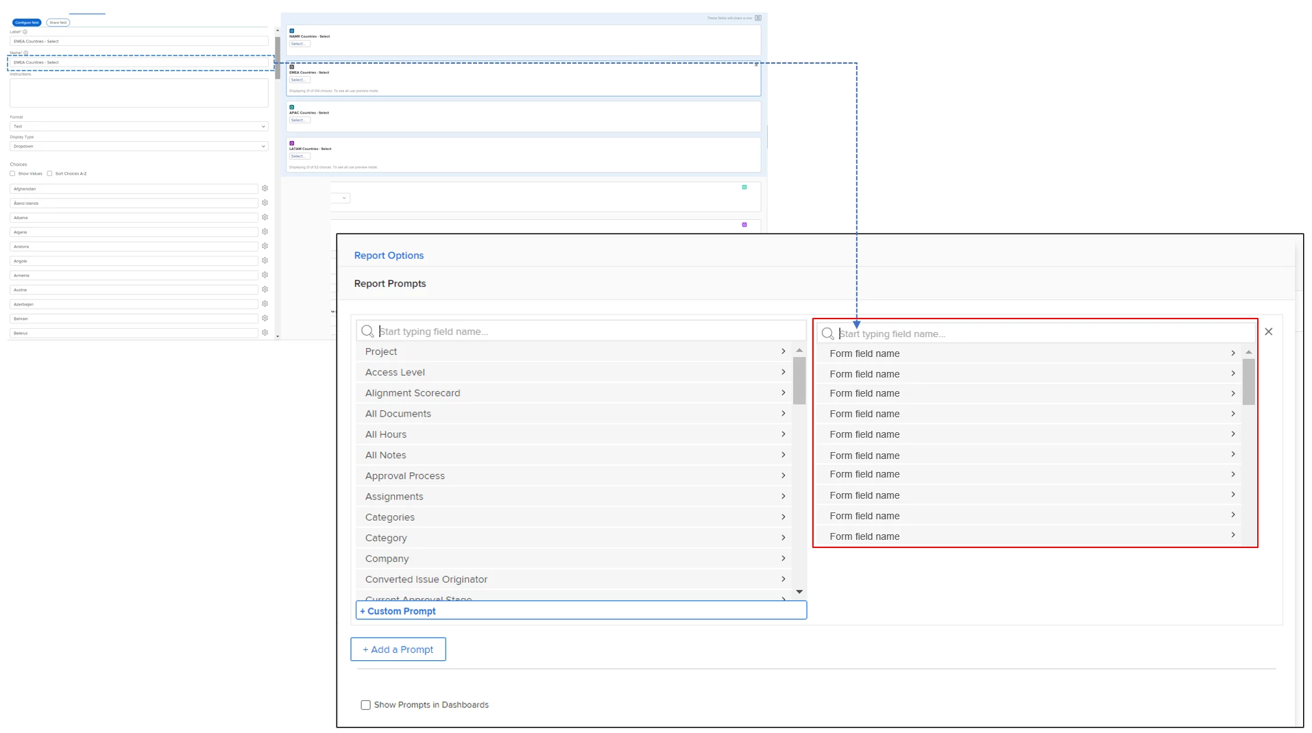 Idea 1: When you build form fields, they become available as a picker for custom prompts. Within a report’s Custom Prompts Options window, a second section could be added where you can type the name of a form field you want to use as a prompt. See image example below.