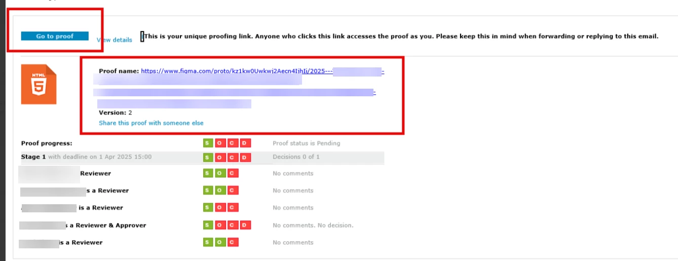 How would you like the feature to work - The CTA to go to the proof should be more prominent and remove the proof link from the email notification. If it's being shared out, we want the proof shared, not the link. This will mitigate opportunities for Reviewers to make comments outside the proof.