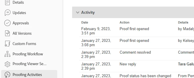 Or can get more detailed look in the Proofing Activities tab of the proof: