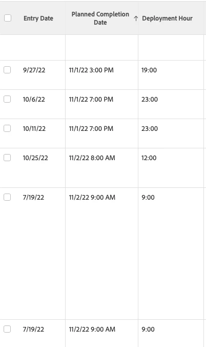 So if the Planned Completion Date is = Oct. 31, 2022 9:00 AM the Deployment Hour should be 9:00 but in some cases it is 13:00.