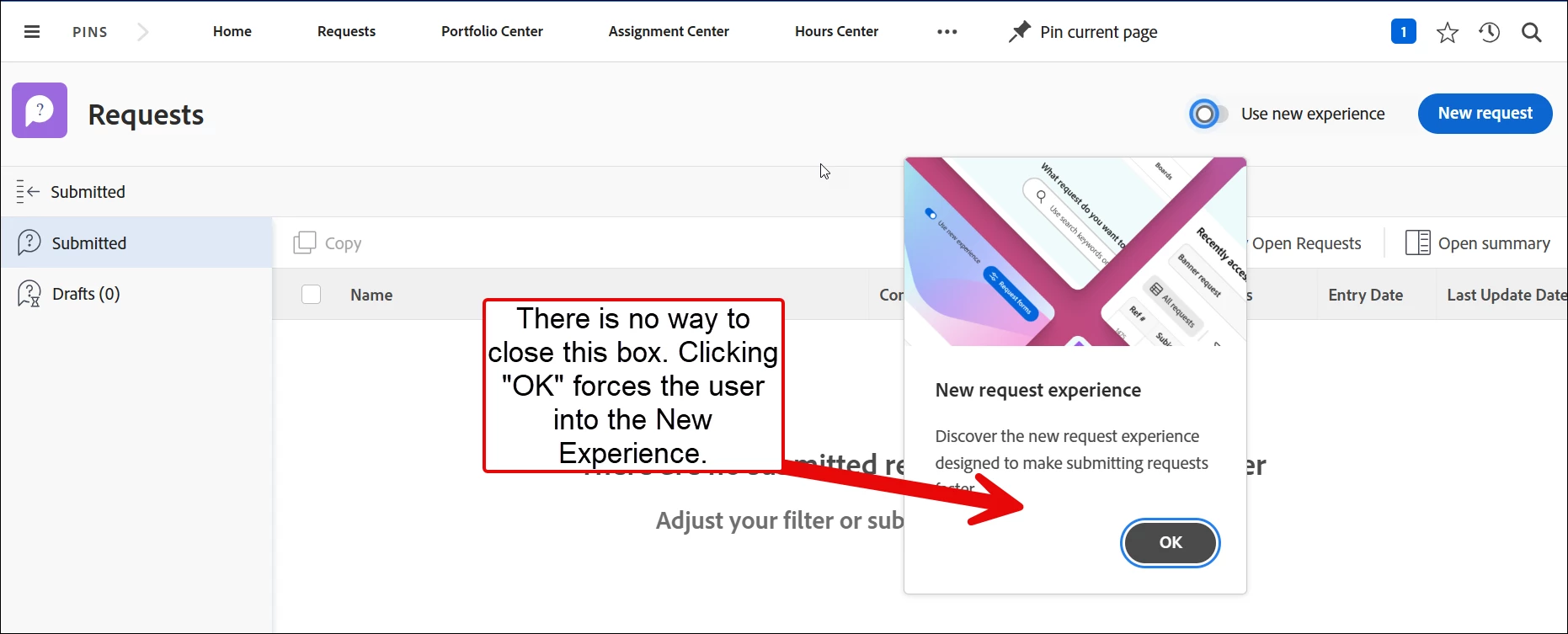 I'm really disappointed that this unfinished experience is being forced onto our user base. Looking at it this morning, I noticed that users cannot close the "New Request Experience" dialog box without being forced to enable the new experience.