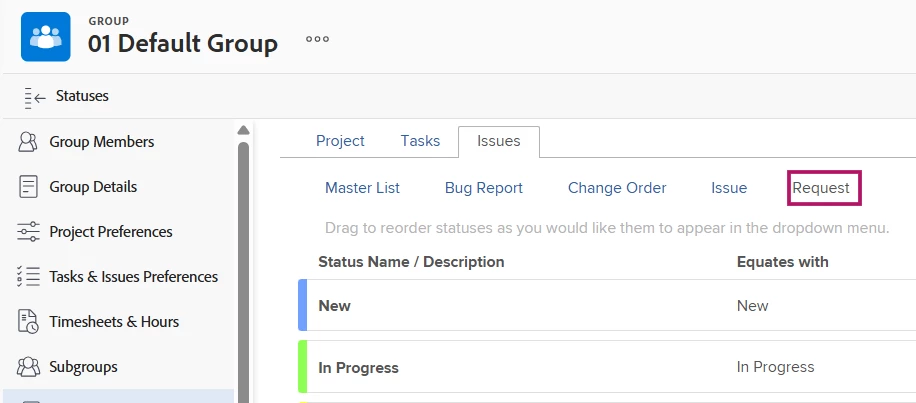 If you're looking at a report is it possible you aren't filtering to the Group which has the statuses created that you expect to see, e.g. the Group used on the Request queue project. Another area to check is in Set Up>Groups>Statuses - check the statuses are set up for Request rather than Issue as per the screenshot.