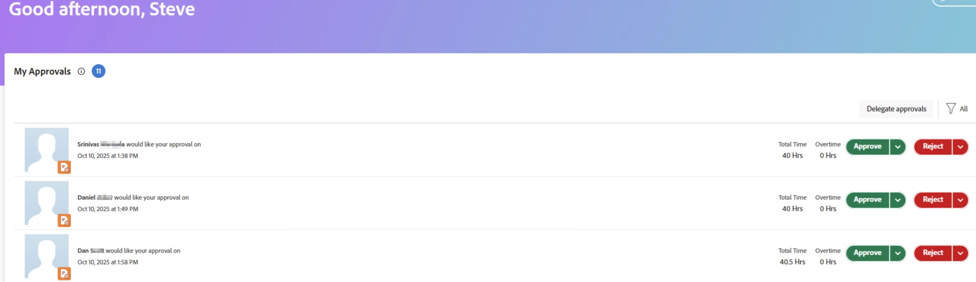 Before this update, the Approvals widget used to show a timesheet date range that linked directly to the actual timesheet. Now, after this update, the date range hyperlink is gone, and users can't view the timesheets. They can only Approve or Reject.