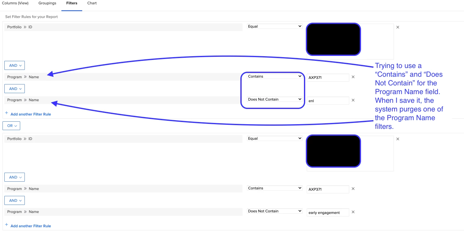 I'm trying to create multiple filters in a report, filtering on the same field (Program Name).