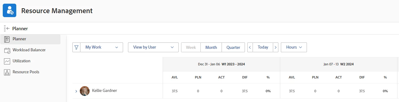 We use Resource > Planner for this. There are some limitations and criteria to make planner work but we like that it shows available, planned, actual and % allocations for users.
