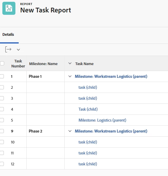 Basically I would like to pull a Workstream report that shows all the tasks that they need to do for that project as its a very long project but we want to keep it contained. So for example : Pull a report that shows all the tasks needed to be done under each Workstream for Logistics (so in the diagram example there would be in the report 4 parent tasks PLUS the sub-tasks under each parent task. So there would be 16 lines if using the attached image). Hope that makes sense!