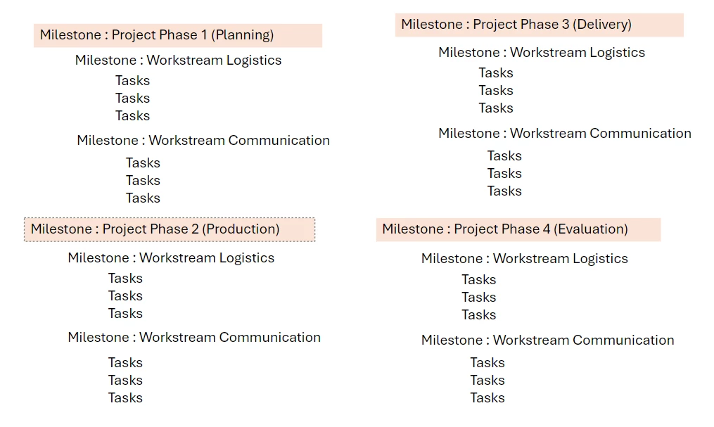 We use for one type of project the Milstone Path to tag both a Project Phase and then the Workstreams in the Project Phase. Under each Workstream there are the tasks that are needed to be done. We have the same Workstreams under each Project Phase (please see attachment) - so Workstreams can be Logistics or Communication or Governance for example.