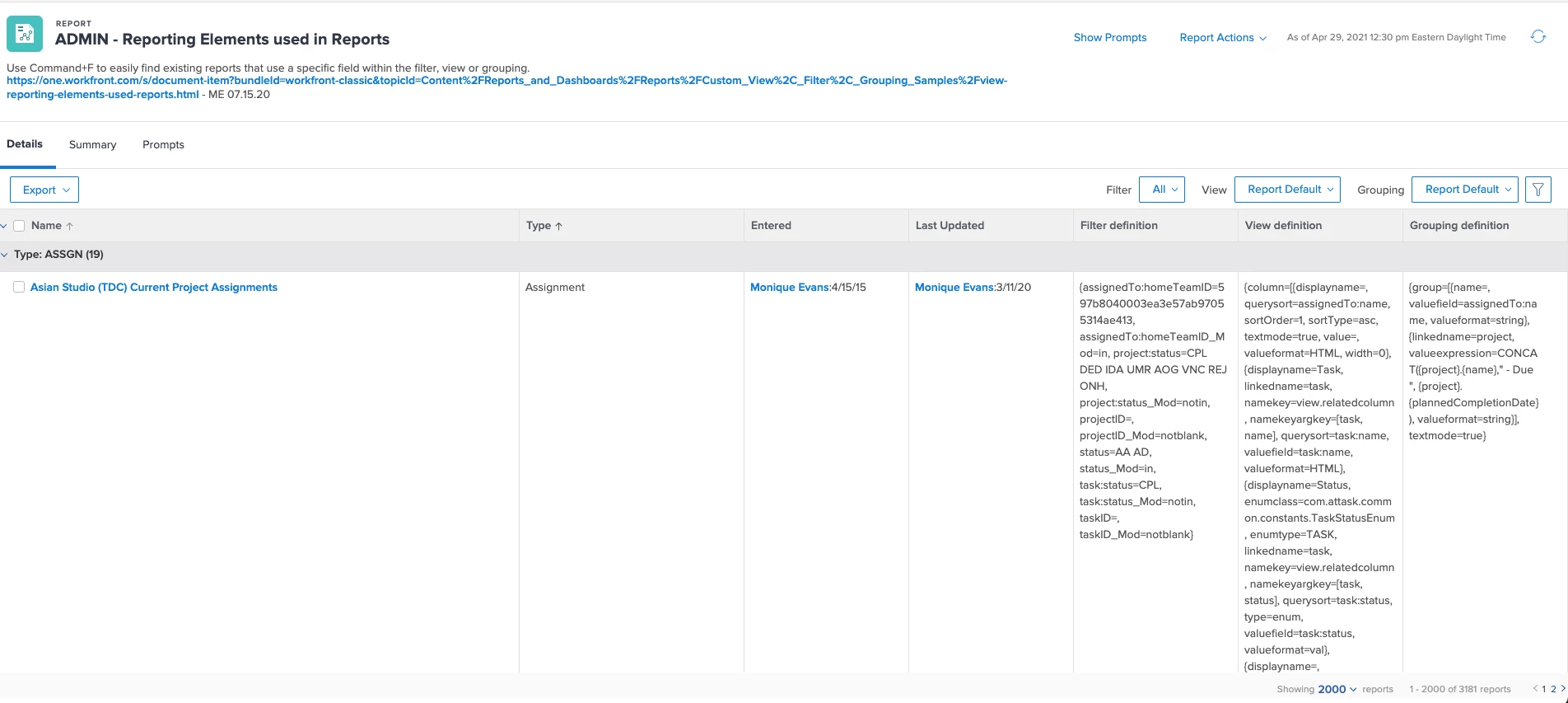 In a few Braindates yesterday I was asked how to report on the reporting elements (view, filter, grouping) within a report. This can be particularly useful when trying to find a specific report as well as when cleaning up reports and easily identifying duplicates. Here is the code for each column. You can also use Command+F (Control+F) to easily find existing reports that use a specific field.