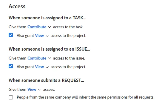 - I have Shared the master project that are used for requests with the Company that makes requests into that project and shared at the highest Manage level