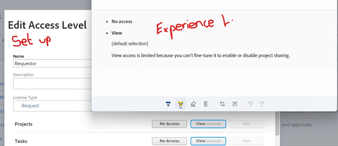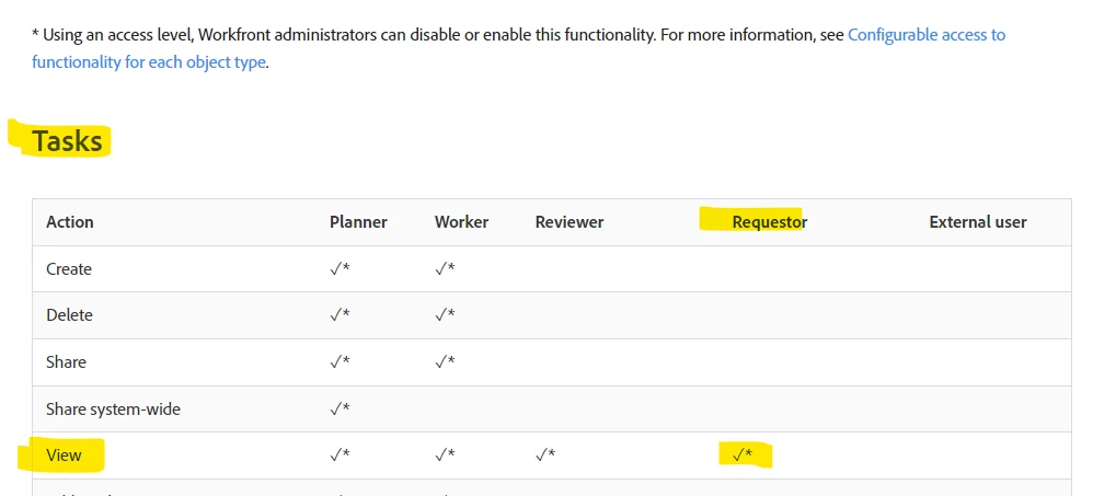 Does anyone who what the limitations are for Requestor licences within Projects / Tasks. My understanding was they have no access to these, but the Experience League page says they can limited access to Tasks. The WF Set Up area has Projects and Tasks as limited with no other options. If it were completely closed it should state no access right?