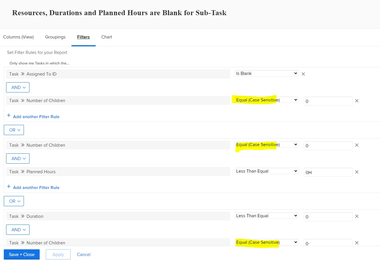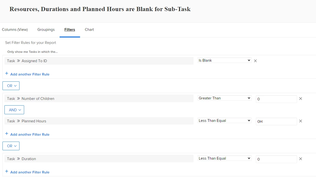 I'm trying to create a report to pull sub-tasks with Blank resources, or Durations or Planned hours. The purpose of this report is to ensure project owners or PMs don't leave any sub-task blank during project planning.