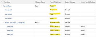 Additionally, something I've done previously was to add a custom form to tasks that had a calculated field for parent task milestone on it. This way it would just capture on the form what the milestone name was and then that can be pulled into reporting and views natively.