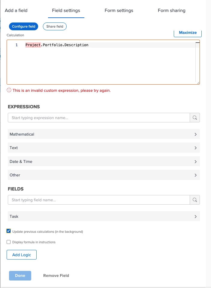 Click Apply. A checkbox for “Update previous calculations (in the background)” has been added to this calculated field (scroll down in the left panel). By selecting that checkbox, the calculated field will automatically be filled in without you having to recalculate the form manually.