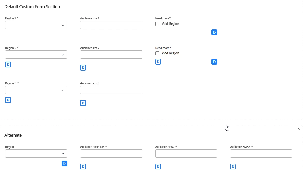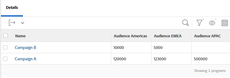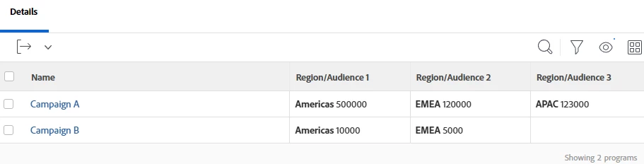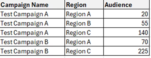 One of the data fields is a multi-select “Region” field, where multiple Regions can be chosen for each Campaign. Another data field is an “Audience” open text box field, where one can indicate a number.