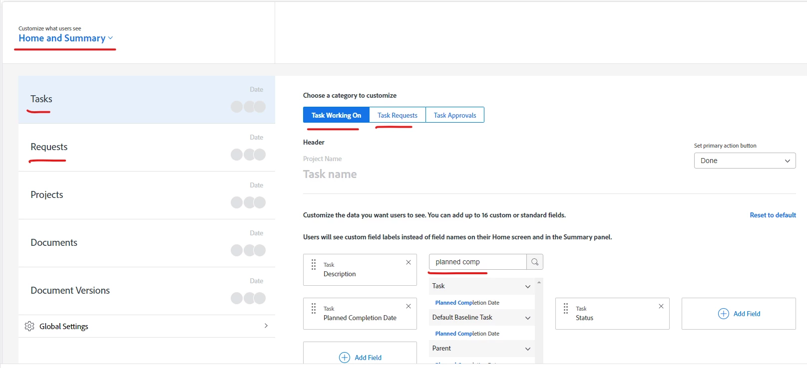 Select "home and summary" and specify on which object types you want users to see Planned Completion Date, e.g. Task, Issues.