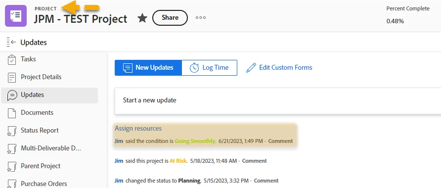 When I go to the project "updates" section, instead of the percent-complete for the task, I see the name of the task and a message about the condition (e.g. Assign Resources, Jim said the condition is Going Smoothly.)