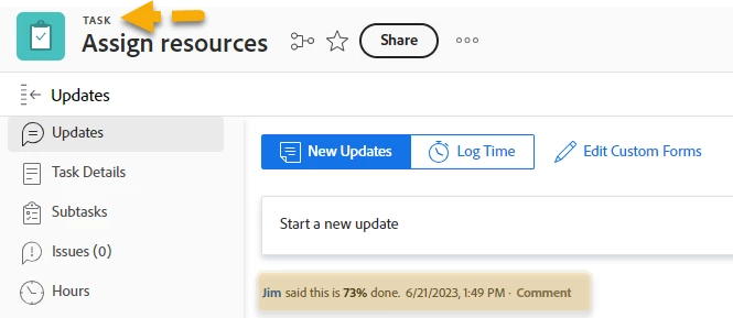 When I go to the task "updates" section, I can see the task's percent-complete listed (e.g. Jim said this is 73% done.)