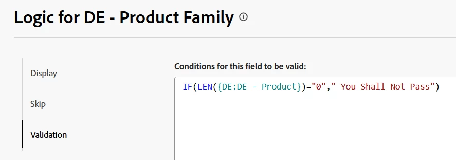 - Unlike Display/Skip logic, field validation formulas can test against any field available while a record is being created.