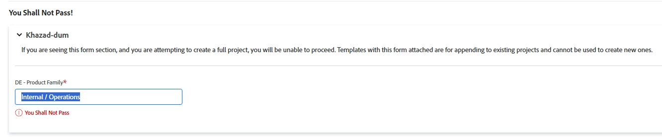 Before Prod implementation, I'd update the form name, comments and errors with something that explains everything much better to my team. I'll also include directions on how to ask for help if the person thinks they have a reason to do what they're trying to do. Sometimes there really are exceptions, and then I have the opportunity to help them navigate that correctly. For the moment, it's Friday afternoon, and 'Lord of the Rings' jokes are happening instead. 😁