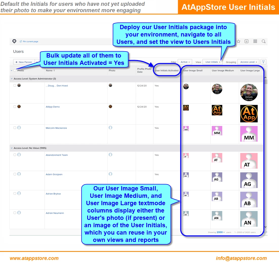 Further to my "I'm intrigued" conversation about User Photos with @John O'Sullivan‚ last week, I have (moments ago) noodled out a way to show a user's Initials if they have not yet set their photo, as shown below. Although I've not yet packaged it up, if you'd be interested in obtaining this solution for your instance, please let me know either here or via doug.denhoed@atappstore.com