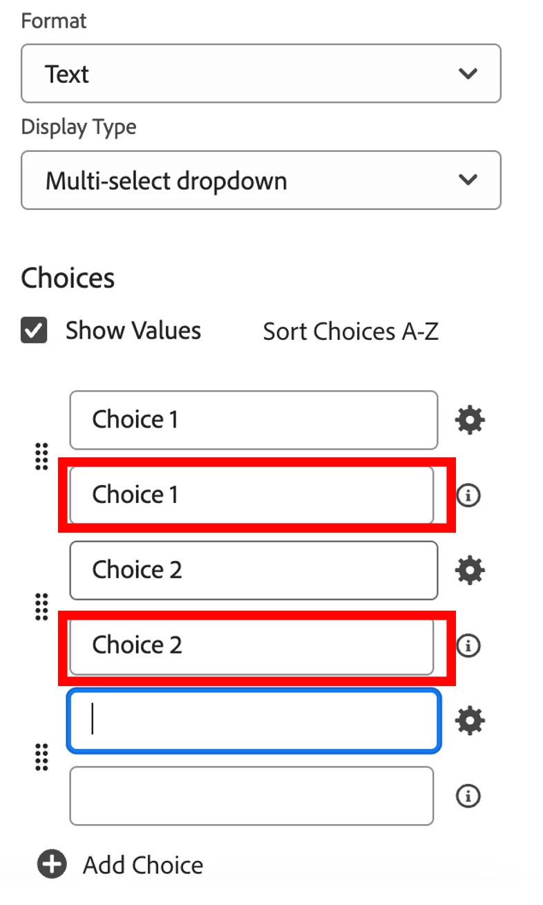 Using custom fields in Workfront forms is a significant enabler of accelerated content velocity in enterprise content supply chains. One innovative use case is leveraging custom forms to rank requests using custom field values. You can input a ‘secret’ value for custom fields when selecting a single-select dropdown and multi-select dropdown for your custom form, as shown below. A ‘secret’ value is the second value associated with the choices you can input into the form (Choice 1 option under the first Choice 1 field in screenshot below). The ‘secret’ value is not seen by the user; rather, it is in the backend of the system and is leveraged for logic and automation.