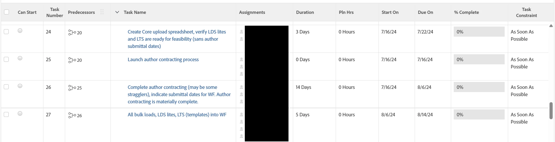 I need to make a tweak to a project schedule I was given. The original schedule has my team's task (task 27) with a basic Finish-Start predecessor of the task before it (task 26):