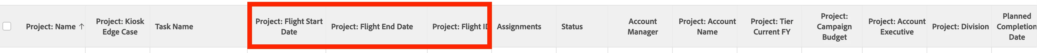 Specifically, the columns in this screenshot for Project: Flight Start Date and Project: Flight End Date are not sorting properly. If I click on those to sort, the data will sort, but it isn't sorting properly by these columns.