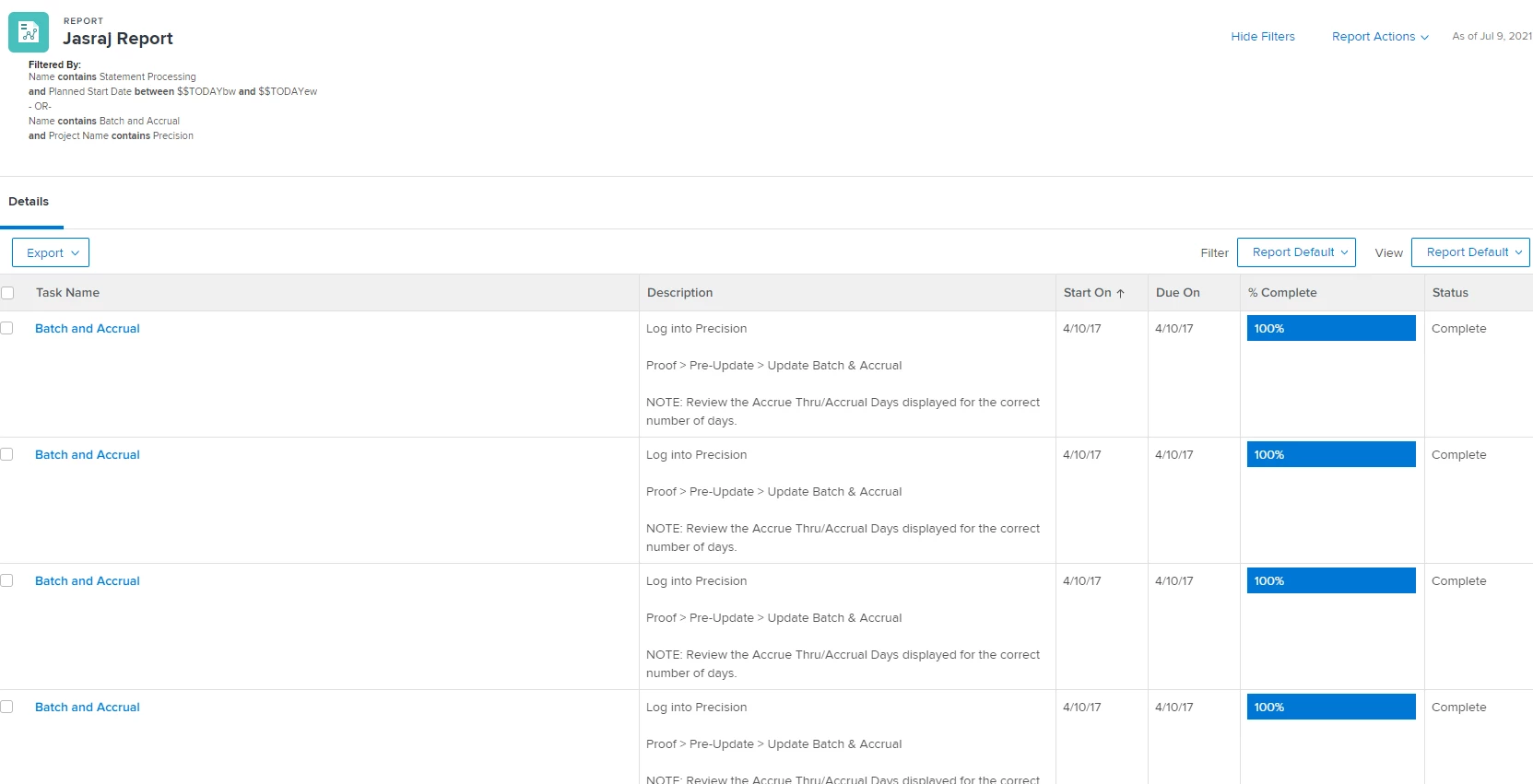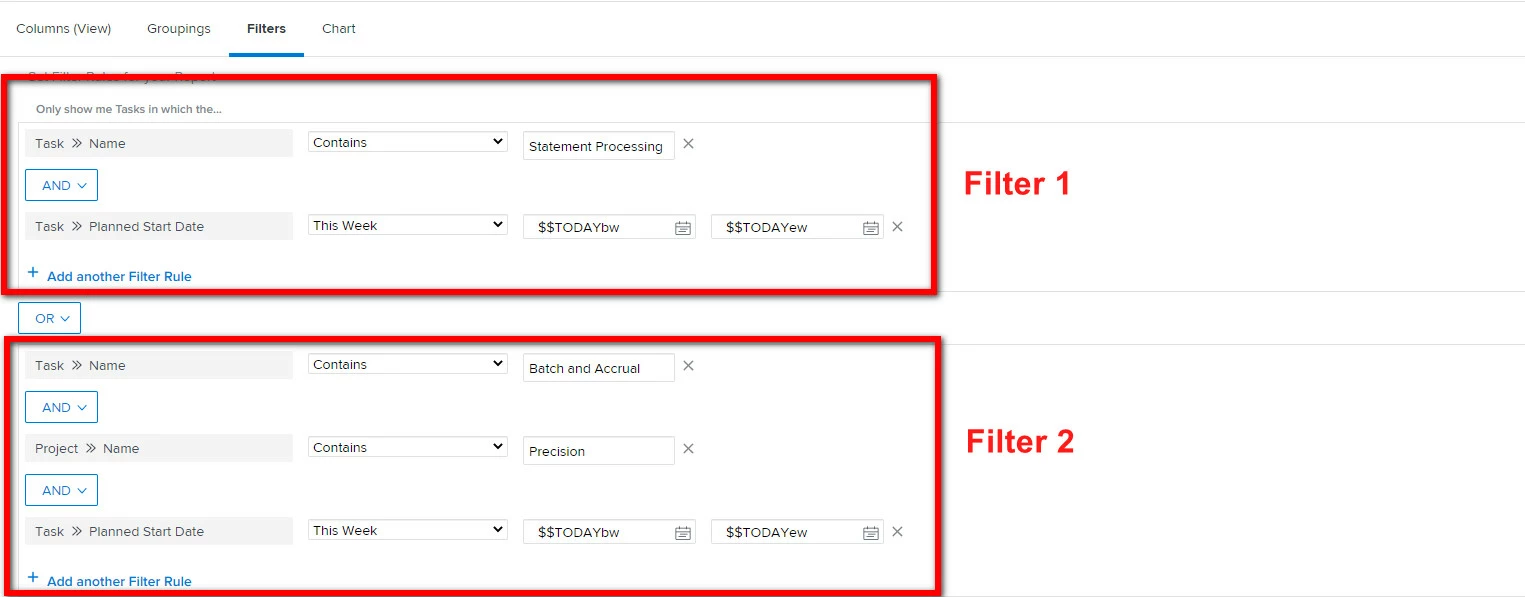 For each of your filter groupings, you need to put in the date filter. Right now, your report is looking for tasks with the name containing 'Statement Processing' with the planned start date this week OR any tasks with the name containing Batch and Accrual and the project name containing Precision. You just need to add the planned start date filter to the second filter.