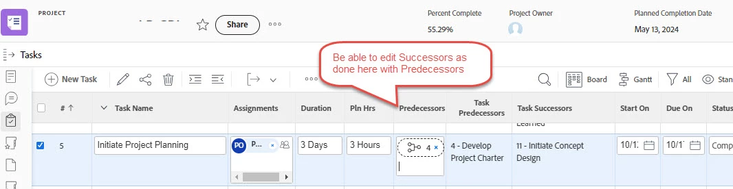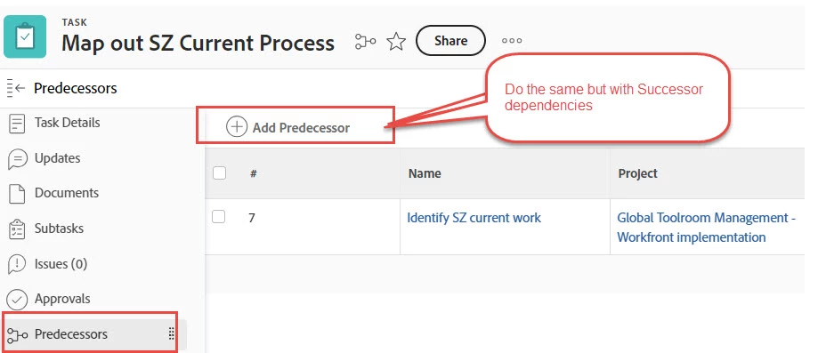MMaria-JoseMa1New ParticipantForum|Forum|2 years agoJanuary 24, 2024NewTask Successors to Display and be added as available with PredecessorsForum|Forum|2 years agoJanuary 24, 20240 replies217 viewsAbility to add Successors to tasks as you can do with Predecessors through the Task left-hand navigation menu, and Tasks ViewsWorkfrontTasks