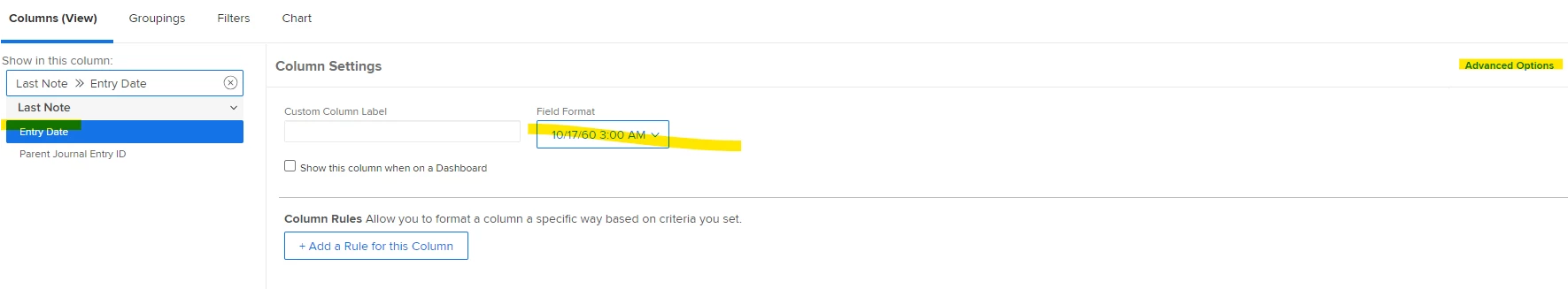 To pull the last note update time, do Last Note > Entry Date and then set it to also show time, if needed.
