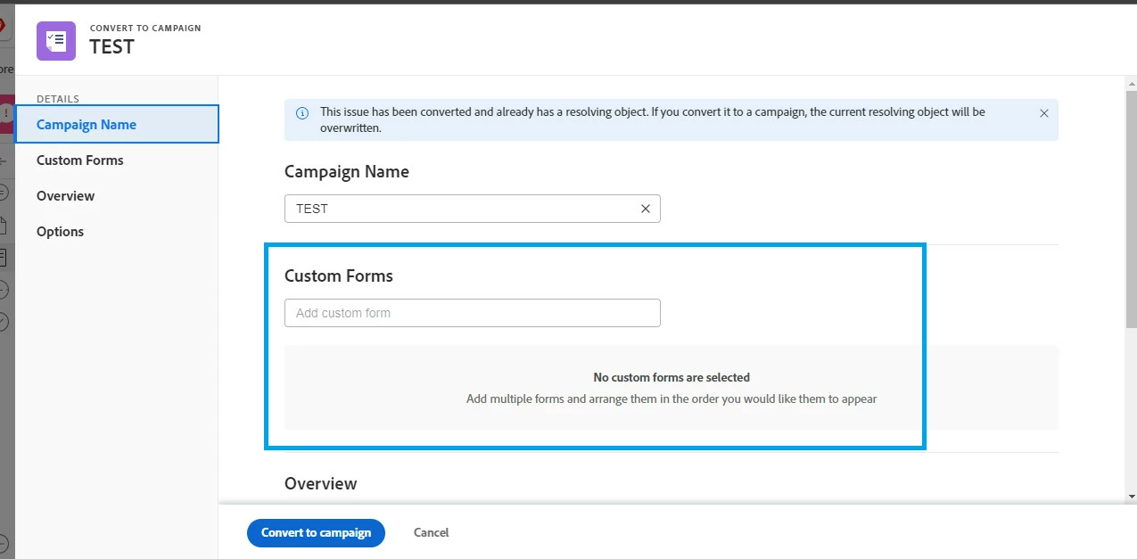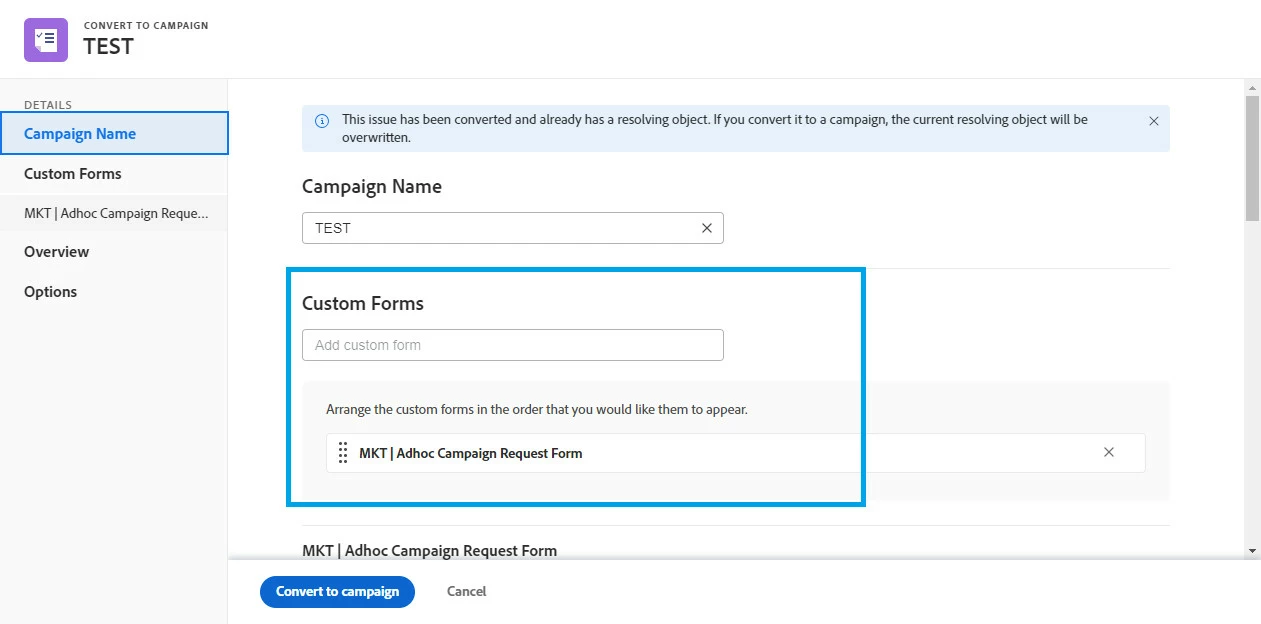 So, what should I do to the setup so the Custom Form is automatically added to the Project when I convert it from an issue to a Project?