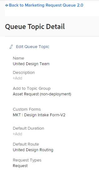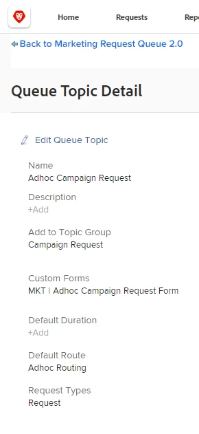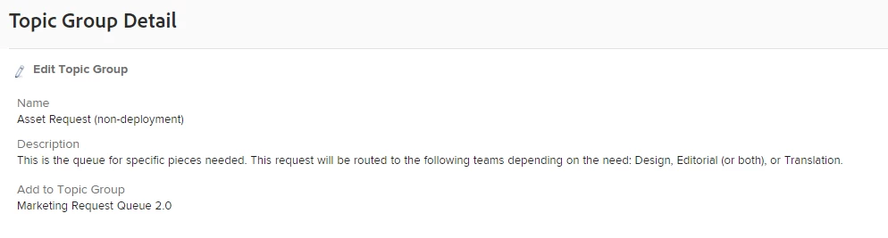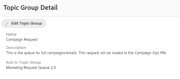 I've a Queue, called Marketing Request Queue, which has 3 Topic groups, and several Queue topics divided among them.