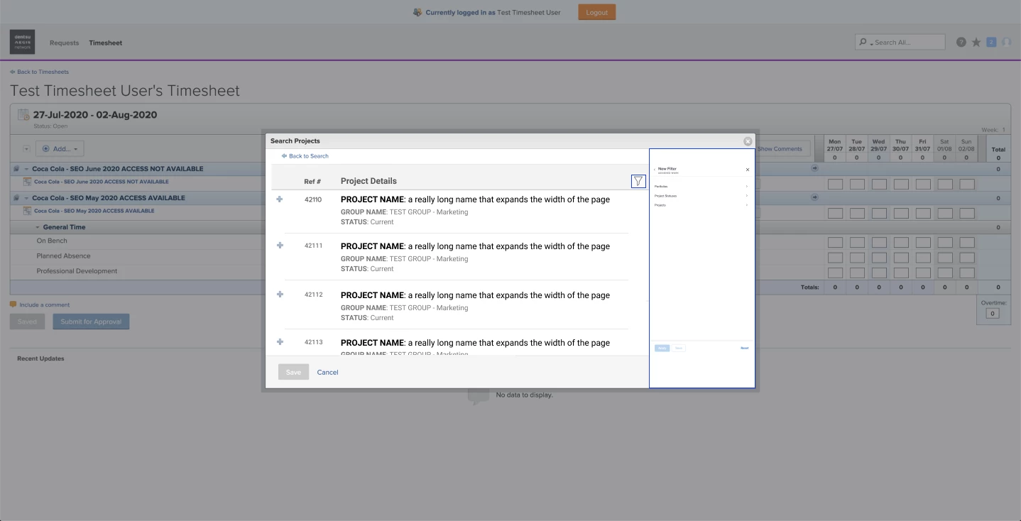 Timesheet - Search Feature Pop Up User Experience / User Interface Enhancement