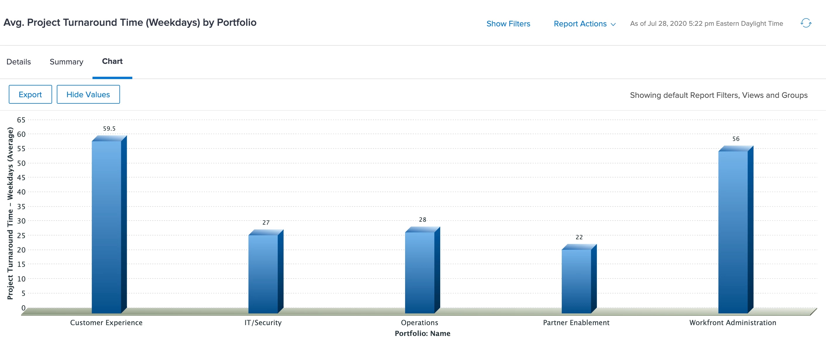 Now that all projects within your system have this custom form attached, you can look to build a customized report with filters, groupings and charts to view turnaround time by portfolio.