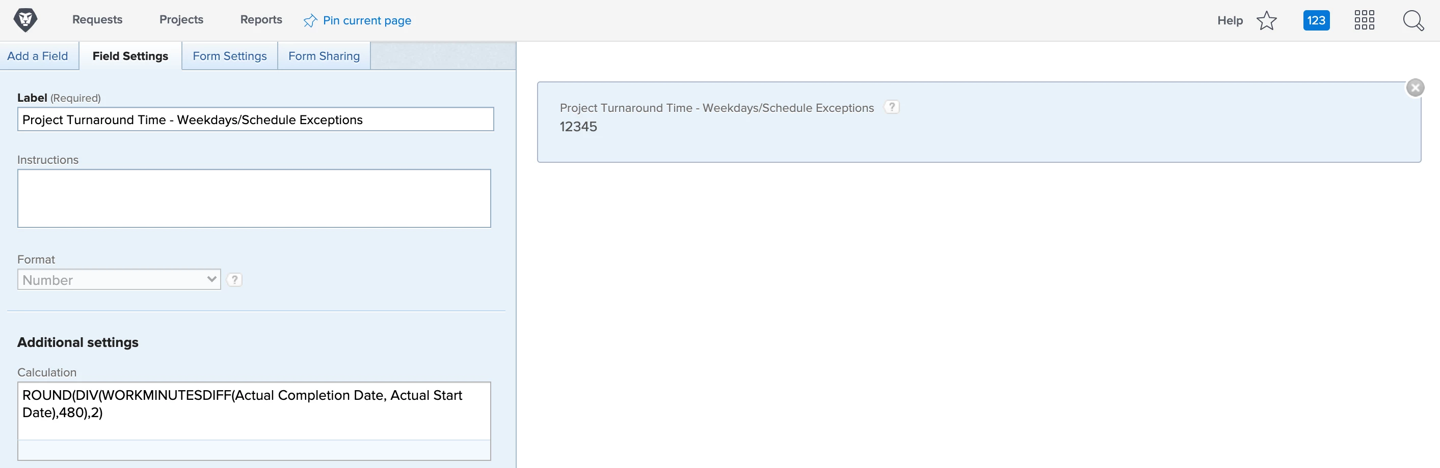 - Add a new calculated field for Project Turnaround Time based on Schedule and set the format to number. Insert the calculation, ROUND(DIV(WORKMINUTESDIFF(Actual Completion Date, Actual Start Date),480),2)