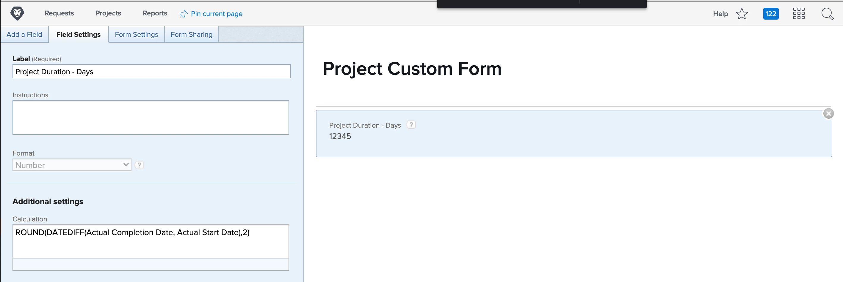 - Add a new calculated field for Project Turnaround Time - Days and set the format to number. Insert the calculation, ROUND(DATEDIFF(Actual Completion Date,Actual Start Date),2).