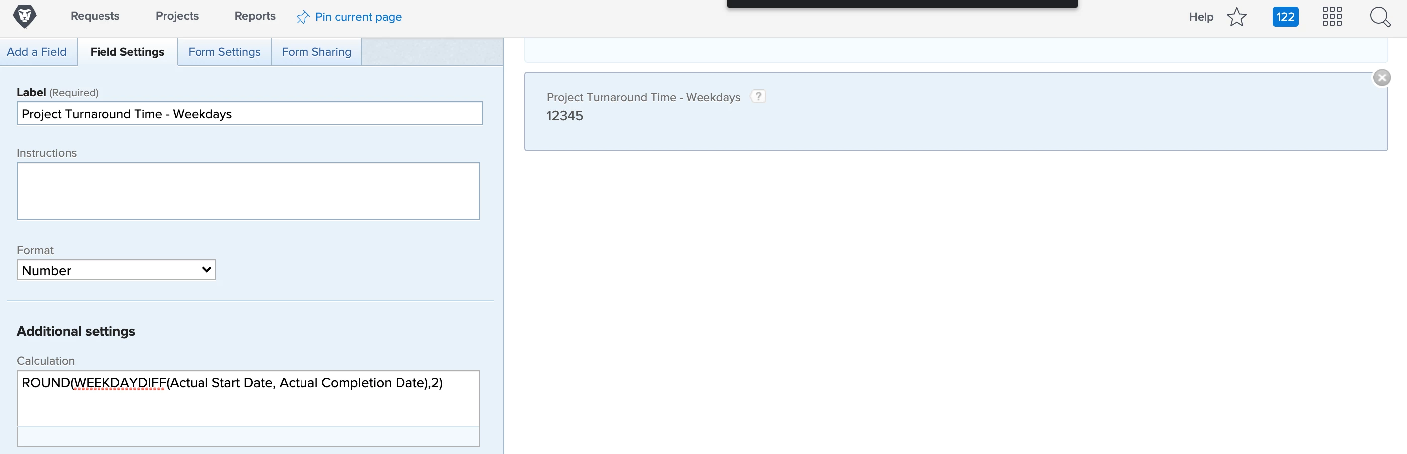 - Add a new calculated field for Project Turnaround Time - Weekdays and set the format to number. Insert the calculation, ROUND(WEEKDAYDIFF(Actual Start Date,Actual Completion Date),2).