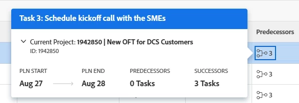 1) I want the predecessor task(s) to show as the predecessor number (w/ hyperlink) as well as the date due. If I can only get one, the date due is a higher priority, but I still need the hyperlink.
