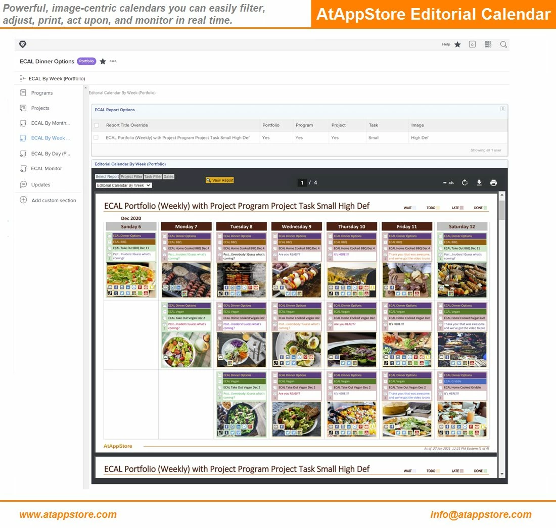 I invite you to consider our Editorial Calendar solution, which provides an image-enabled set of calendars you can easily filter, adjust, print, act upon, and monitor, all in real time, as per this video and the screenshot below.