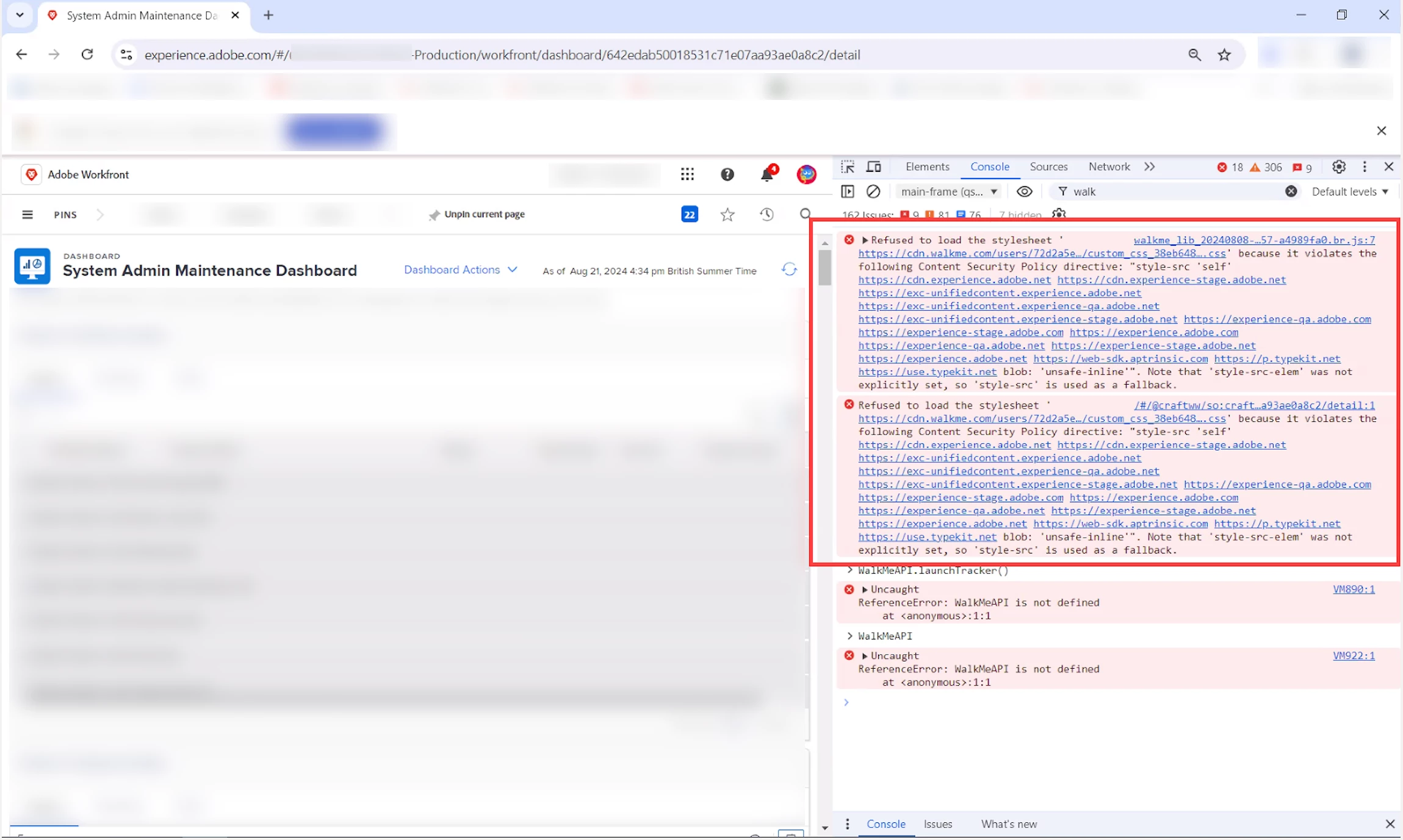 After migrating to the Admin Console environment, the WalkMe integration used by IPG has lost connectivity to Workfront. WalkMe previously worked in their original environment before the URL was migrated to experience.adobe.com. The issue seems to stem from the current Content Security Policy (CSP) for adobe.com and adobe.net, which is blocking the WalkMe scripts and resources necessary for the tool to function.